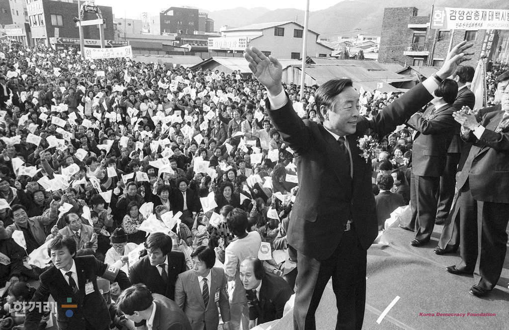 - 1989년 3월 18일 민주당 온양지구당 국정보고대회가 열린 온양 온천국민학교에서 김영삼 민주당 총재가 승리의 V자 표시로 청중의 환호에 답하고 있다.