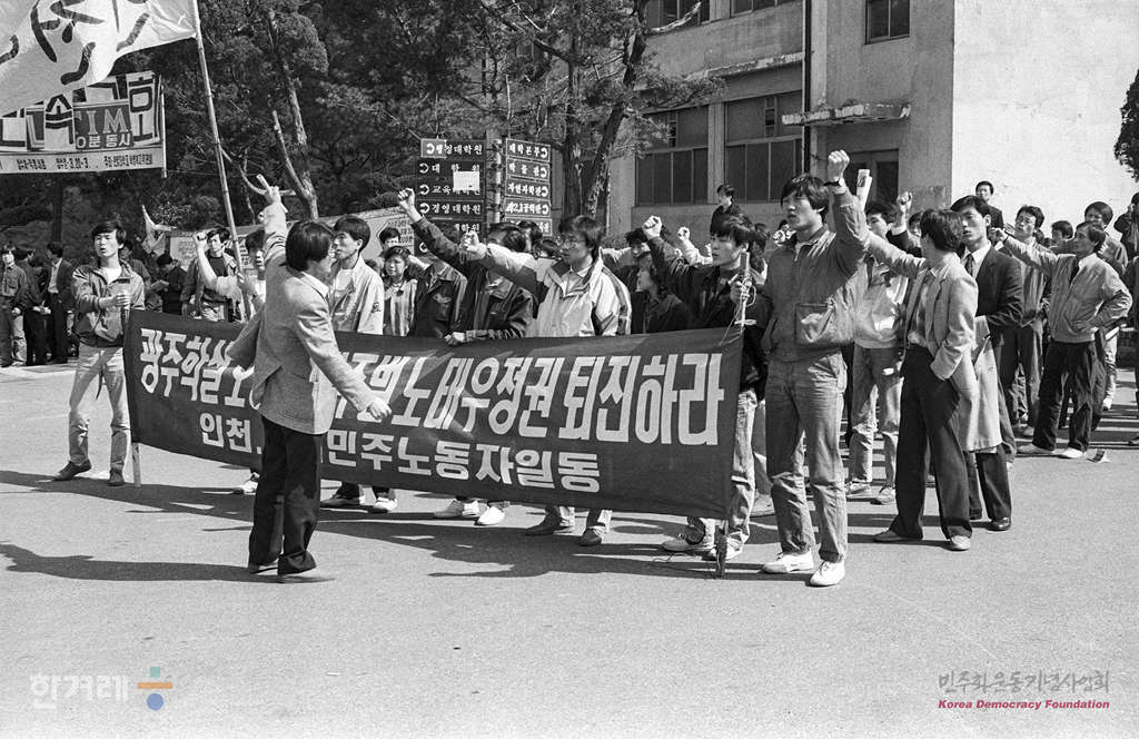 - 1989년 3월 19일 오후3시 전민련을 중심으로 결성된 노태우정권퇴진 공동투쟁본부 주최한 노태우정권 불신임투쟁 선포대회가 서울 한양대학교 노천극장에서 열려 학생 노동자 시민들이 참석한 가운데 불신임운동을 단계적으로 강화해갈 방침을 결의하고 있다. 이에앞서 같은 장소에서 2시부터 지하철노조 탄압저지 공동대책위원회와 위장폐업공동투쟁위원회 주최로 노동운동탄압규탄 궐기대회가 열렸다.