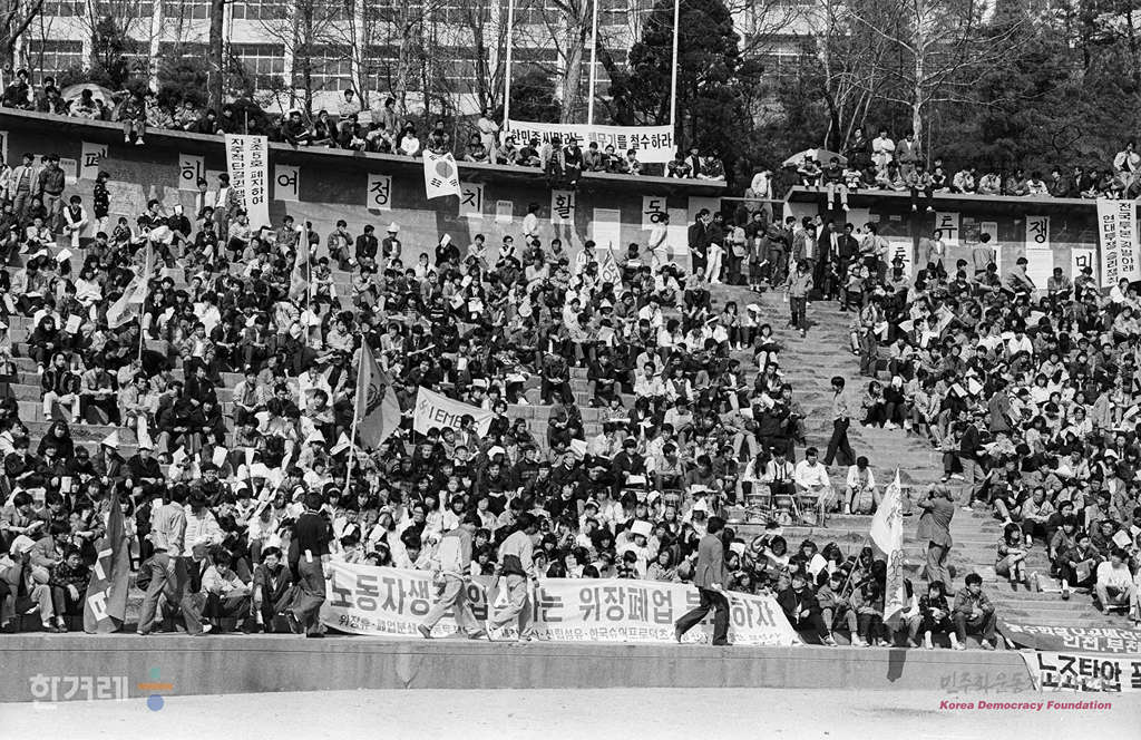 - 1989년 3월 19일 오후3시 전민련을 중심으로 결성된 노태우정권퇴진 공동투쟁본부 주최한 노태우정권 불신임투쟁 선포대회가 서울 한양대학교 노천극장에서 열려 학생 노동자 시민들이 참석한 가운데 불신임운동을 단계적으로 강화해갈 방침을 결의하고 있다.