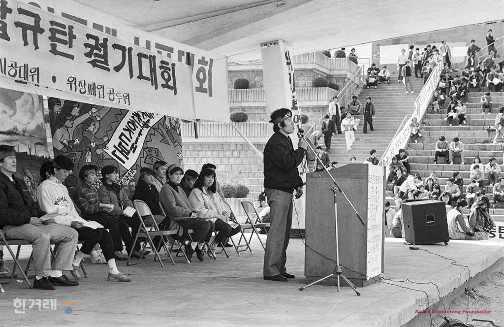- 1989년 3월 19일 오후3시 전민련을 중심으로 결성된 노태우정권퇴진 공동투쟁본부 주최한 노태우정권 불신임투쟁 선포대회가 서울 한양대학교 노천극장에서 열려 학생 노동자 시민들이 참석한 가운데 불신임운동을 단계적으로 강화해갈 방침을 결의하고 있다. 이에앞서 같은 장소에서 2시부터 지하철노조 탄압저지 공동대책위원회와 위장폐업공동투쟁위원회 주최로 노동운동탄압규탄 궐기대회가 열렸다.