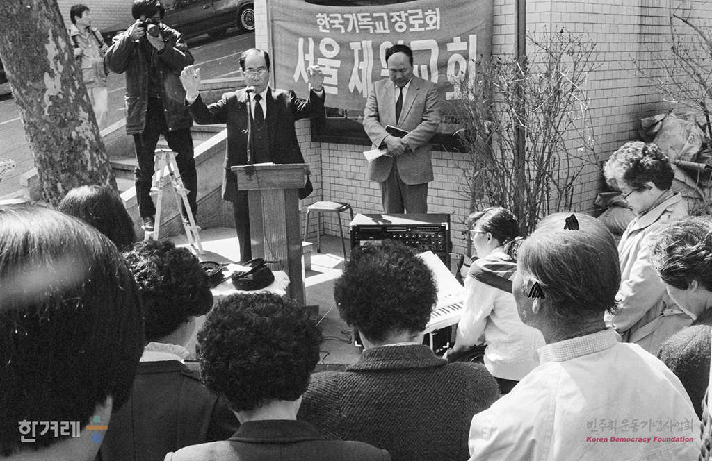 - 1988년 3월 19일 서울 중구소재 서울제일교회 박형규 목사와 교인들이 서울 중부경찰서앞에서 노상예배를 하고 있다. 이들은 지난 1983년 10월부터 이듬해 12월가지 박목사의 활동을 반대하는 세력에 의해 교회 안에서 감금되거나 폭행을 당하고 족겨나 1984년 12월부터 매주 일요일 같은 장소에서 노상예배를 하고 있다.