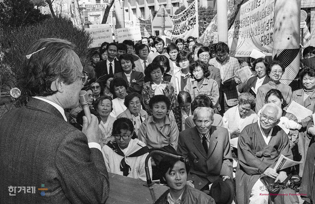 - 1988년 3월 19일 서울 중구소재 서울제일교회 박형규 목사와 교인들이 서울 중부경찰서앞에서 노상예배를 하고 있다. 이들은 지난 1983년 10월부터 이듬해 12월가지 박목사의 활동을 반대하는 세력에 의해 교회 안에서 감금되거나 폭행을 당하고 족겨나 1984년 12월부터 매주 일요일 같은 장소에서 노상예배를 하고 있다.