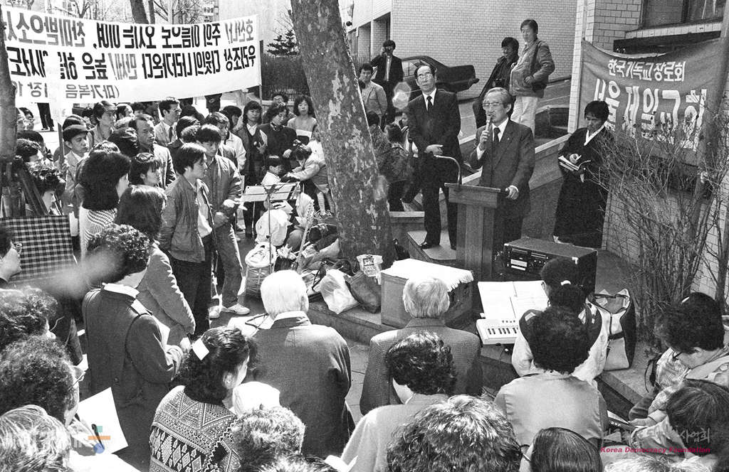 - 1988년 3월 19일 서울 중구소재 서울제일교회 박형규 목사와 교인들이 서울 중부경찰서앞에서 노상예배를 하고 있다. 이들은 지난 1983년 10월부터 이듬해 12월가지 박목사의 활동을 반대하는 세력에 의해 교회 안에서 감금되거나 폭행을 당하고 족겨나 1984년 12월부터 매주 일요일 같은 장소에서 노상예배를 하고 있다.