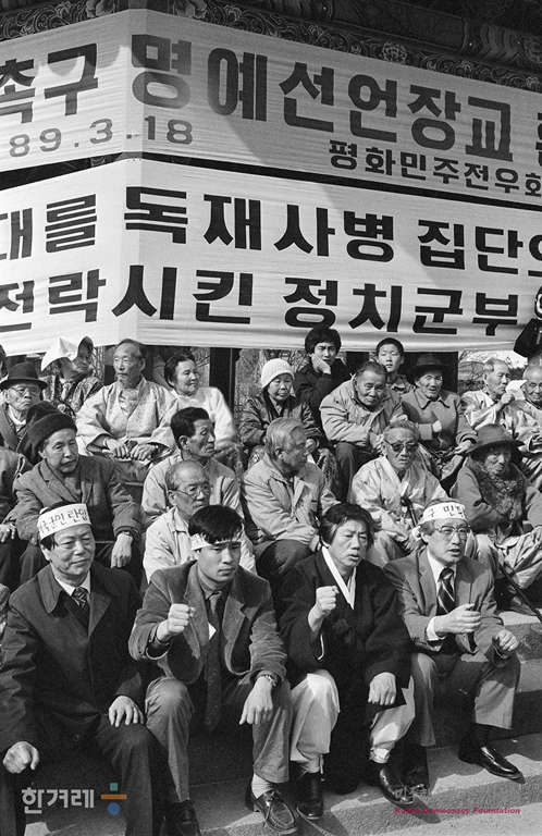 - 1989년 3월 18일. 오후3시 경희대 민주동우회 민가협 등 9개 단체는 서울 종로3가 파고다공원에서 이동균(30. 전 육군대위 명예선언장교 )시와 문익환 계훈제씨 등 재야인사, 시민 5백여명이 참석한 가운데 군 민주화 촉구 및 명예선언장교 환영대회를 하고 있다.