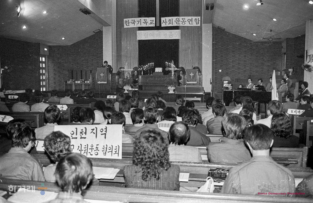 - 1989년 3월 20일 전국 12개 지역별 부문별 기독교 사회운동단체의 총 연합체인 한국기독교사회운동연합(기사련)이 서울 종로구 동대문교회에서 창립총회를 갖고 정식으로 출범하고 있다. 이날 총회에서 오충일, 박영모, 전병생 목사와 이봉구 장로 등 4명을 공동의장으로 선임했다. 촬영