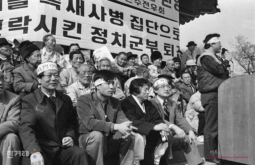 - 1989년 3월 18일. 오후3시 경희대 민주동우회 민가협 등 9개 단체는 서울 종로3가 파고다공원에서 이동균(30. 전 육군대위 명예선언장교 )시와 문익환 계훈제씨 등 재야인사, 시민 5백여명이 참석한 가운데 군 민주화 촉구 및 명예선언장교 환영대회를 하고 있다.