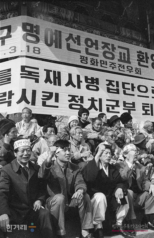 - 1989년 3월 18일. 오후3시 경희대 민주동우회 민가협 등 9개 단체는 서울 종로3가 파고다공원에서 이동균(30. 전 육군대위 명예선언장교 )시와 문익환 계훈제씨 등 재야인사, 시민 5백여명이 참석한 가운데 군 민주화 촉구 및 명예선언장교 환영대회를 하고 있다.
