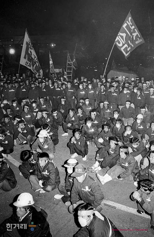 - 1989년 3월 21일 1백일째 파업중인 현대중공업 노동자들이 중공업운동장에서 ’파업 1백일 결의대회‘를 가진 뒤 회사정문앞에서 공권력개입 반대하며 농성을 벌이고 있다.