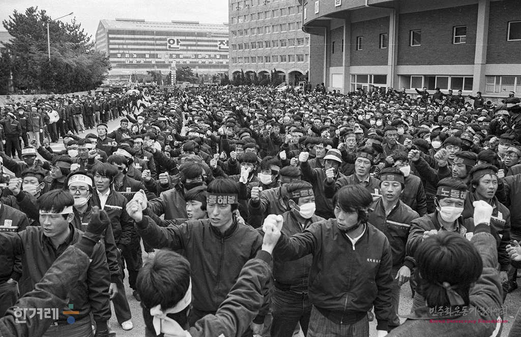 - 1989년 3월 21일 1백일째 파업중인 현대중공업 노동자들이 중공업운동장에서 ’파업 1백일 결의대회‘를 가진 뒤 회사정문앞에서 공권력개입 반대하며 농성을 벌이고 있다.
