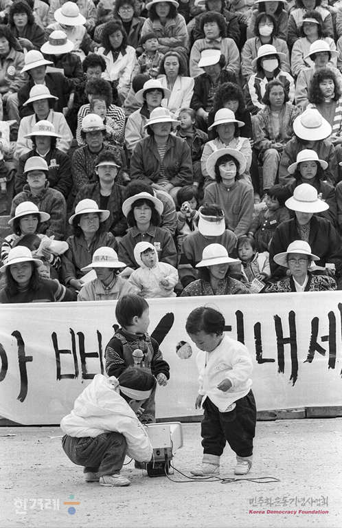 - 1989년 3월 21일 1백일째 파업중인 현대중공업 노동자들이 중공업운동장에서 ’파업 1백일 결의대회‘를 하고 있다.