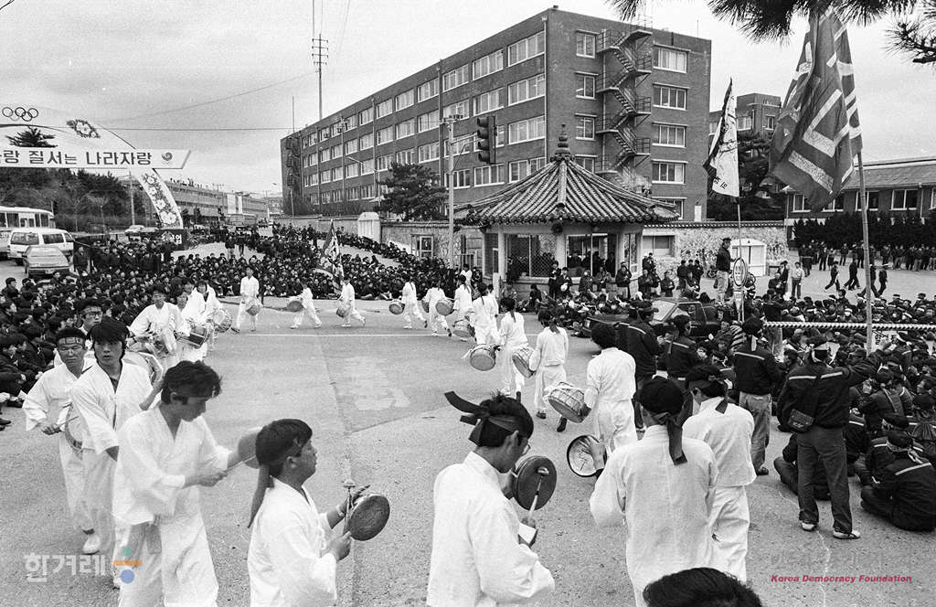 - 1989년 3월 21일 1백일째 파업중인 현대중공업 노동자들이 중공업운동장에서 ’파업 1백일 결의대회‘를 가진 뒤 회사정문앞에서 공권력개입 반대하며 농성을 벌이고 있다.