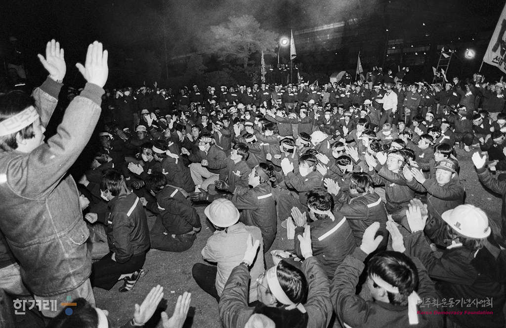 - 1989년 3월 21일 1백일째 파업중인 현대중공업 노동자들이 중공업운동장에서 ’파업 1백일 결의대회‘를 가진 뒤 회사정문앞에서 공권력개입 반대하며 농성을 벌이고 있다.
