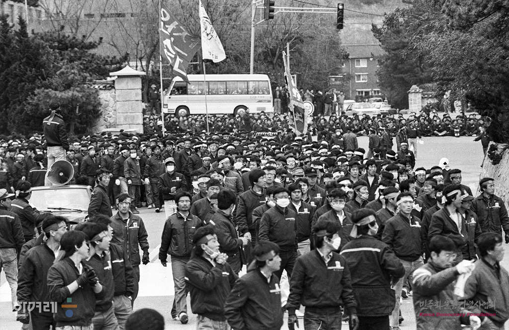 - 1989년 3월 21일 1백일째 파업중인 현대중공업 노동자들이 중공업운동장에서 ’파업 1백일 결의대회‘를 가진 뒤 회사정문앞에서 공권력개입 반대하며 농성을 벌이고 있다.