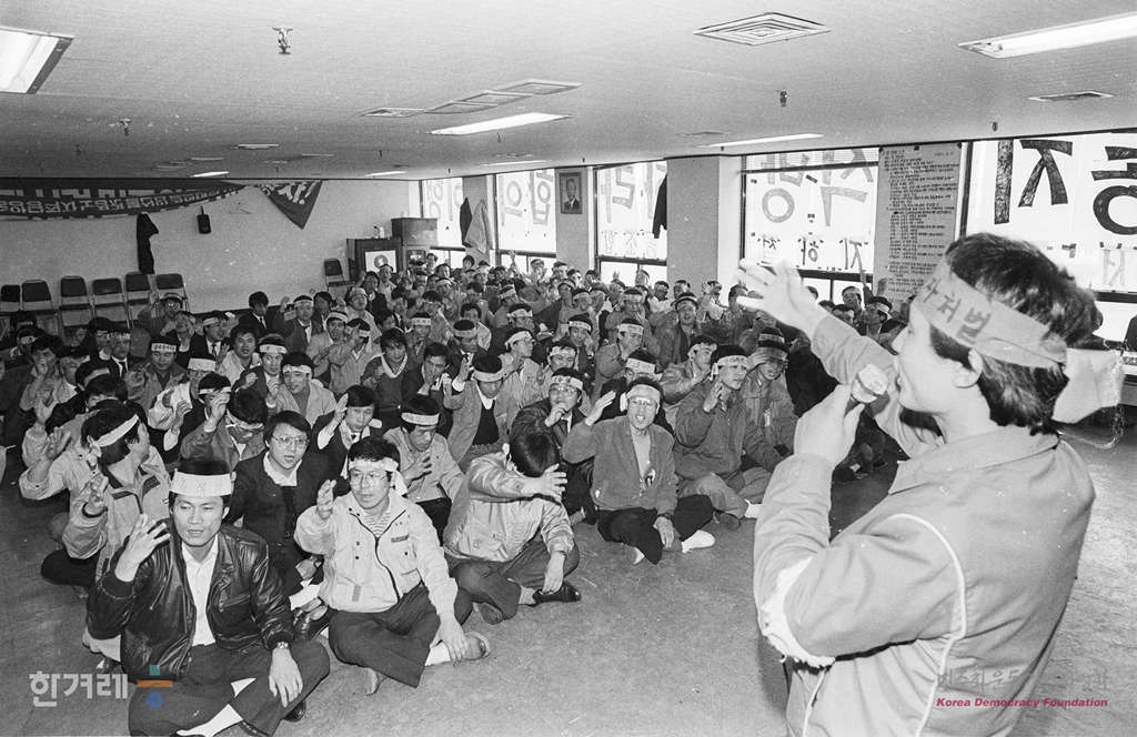 - 1989년 3월 20일 서울지하철노조 조합원들이 민주당 중앙당사에서 구속노동자 전원석방을 요구하며 농성을 하고 있다.