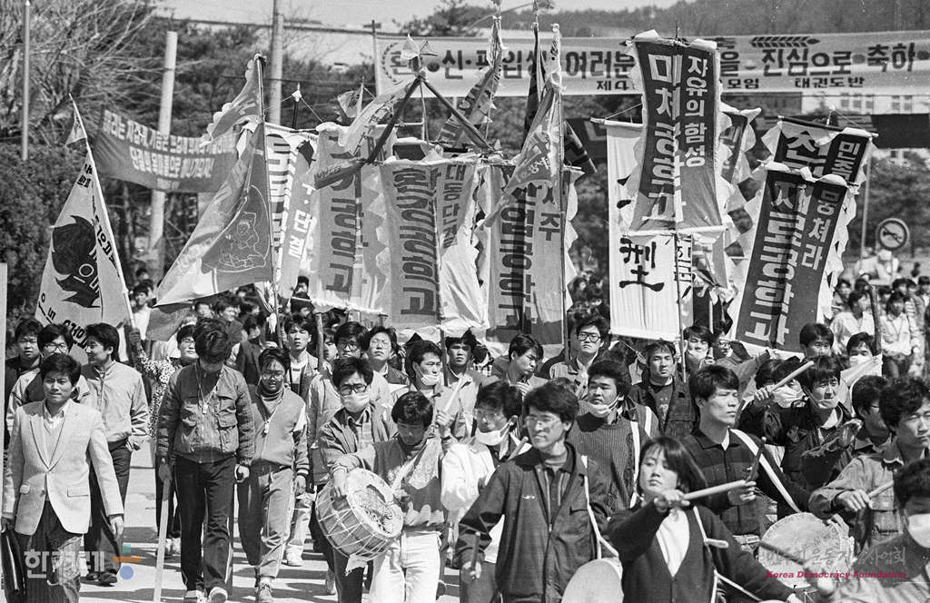 - 1989년 3월 19일 오후3시 전민련을 중심으로 결성된 ’노태우정권 퇴진 공동투쟁본부‘(워원장 이부영전민련의장)는 한양대 노천극장에서 시민 학생 노동자 6천여명이 참석한 가운데 노태우정권 불신임투쟁 선포대회를 하는 전 대학생들은 대열을 만들어 행진을 하고 있다.