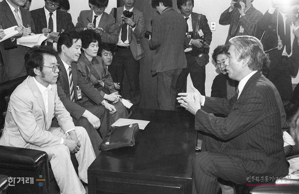 - 1989년 3월 22일. 국회 5공특위가 개최하는 의문사 관련 청문회에 피해자쪽 증인인 유가협회원들이 국회를 방문해 이기택위원장을 만나 청문회 불참의사를 전달하고 있다. 아닐 유가족들은 가해자쪽 증인들이 대부분 증언을 거부하고 텔레비전 생중계가 이뤄지지 않는 점을 지적하며 공정조사가 이뤄질 수 없는 여건이라고 했다.
