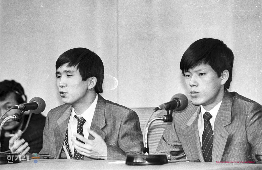 - 1989년 3월 23일 오전 9시 30분 체코에서 휴학하다 지난달 25일 한국으로 망명한 북한 대학생 조승군씨(왼쪽)과김은철씨는 서울 프레스센터 국제회의장에서 기자회견을 하고 있다.