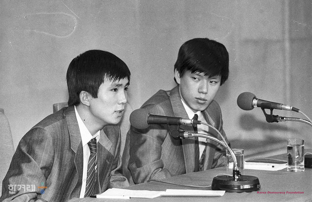 - 1989년 3월 23일 오전 9시 30분 체코에서 휴학하다 지난달 25일 한국으로 망명한 북한 대학생 조승군씨(왼쪽)과김은철씨는 서울 프레스센터 국제회의장에서 기자회견을 하고 있다.