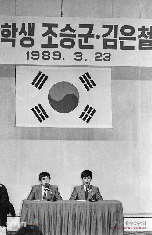 - 1989년 3월 23일 오전 9시 30분 체코에서 휴학하다 지난달 25일 한국으로 망명한 북한 대학생 조승군씨(왼쪽)과김은철씨는 서울 프레스센터 국제회의장에서 기자회견을 하고 있다.