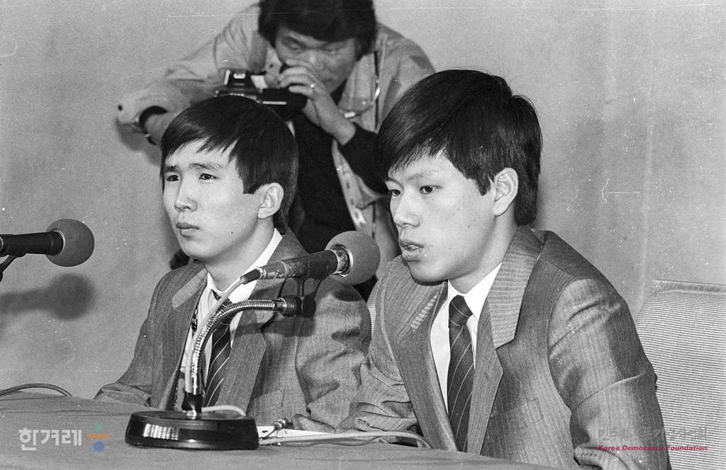 - 1989년 3월 23일 오전 9시 30분 체코에서 휴학하다 지난달 25일 한국으로 망명한 북한 대학생 조승군씨(왼쪽)과김은철씨는 서울 프레스센터 국제회의장에서 기자회견을 하고 있다.