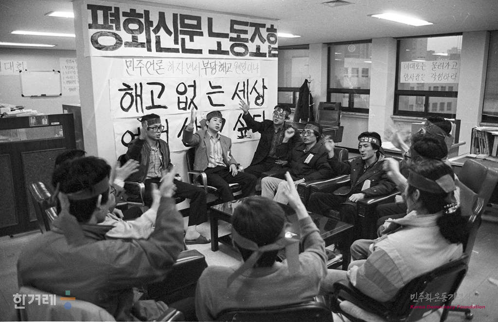 - 1989년 3월 23일. 지난해 5월 15일 창간된 평화신문(발행인 김수환추기경)이 노조간부들에 대한 무더기 해고조치와 관련해 서울 중구 저동 편집국 사무실에서 부당해고 철회 등을 요구하며 7일째 밤샘농성을 벌이고 있다.