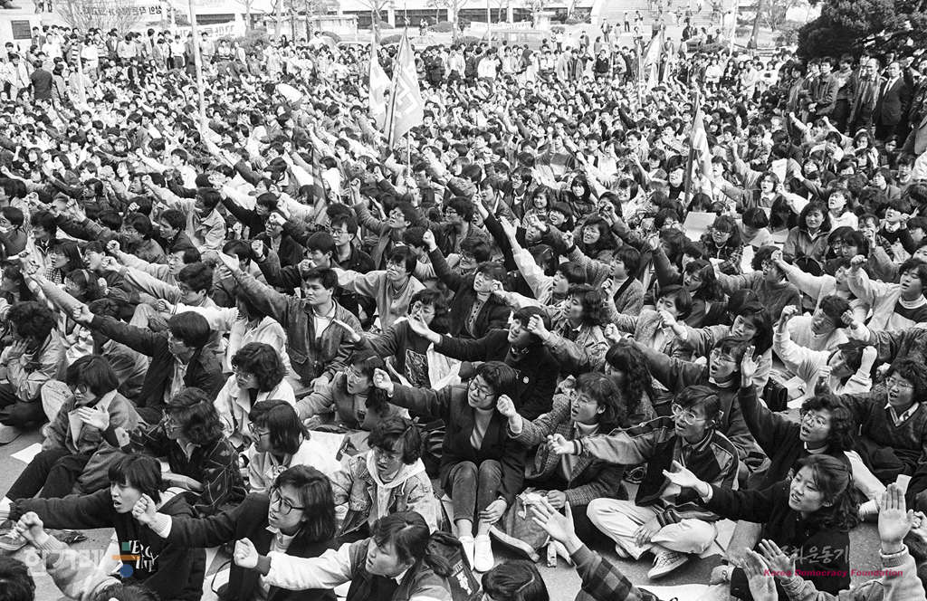 - 1989년 3월 25일 오후2시 서울지역 총학생회연합 소속 대학생들이 서울 연세대 도서관앞 민주광장에서 ‘광주학살, 5공비리 주범 노정권 퇴진을 위한 청년학도 발대식 및 노동운동 탄압 결의대회’를 갖고 노정권 퇴진운동에 적극 나설 것을 결의하고 있다.