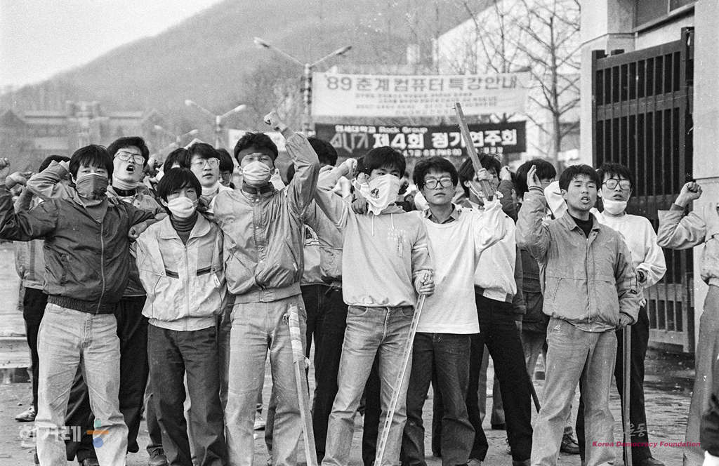 - 1989년 3월 25일 오후2시 서울지역 총학생회연합 소속 대학생들이 서울 연세대 도서관앞 민주광장에서 ‘광주학살, 5공비리 주범 노정권 퇴진을 위한 청년학도 발대식 및 노동운동 탄압 결의대회’를 갖고 노정권 퇴진운동에 적극 나설 것을 결의하고 있다.
