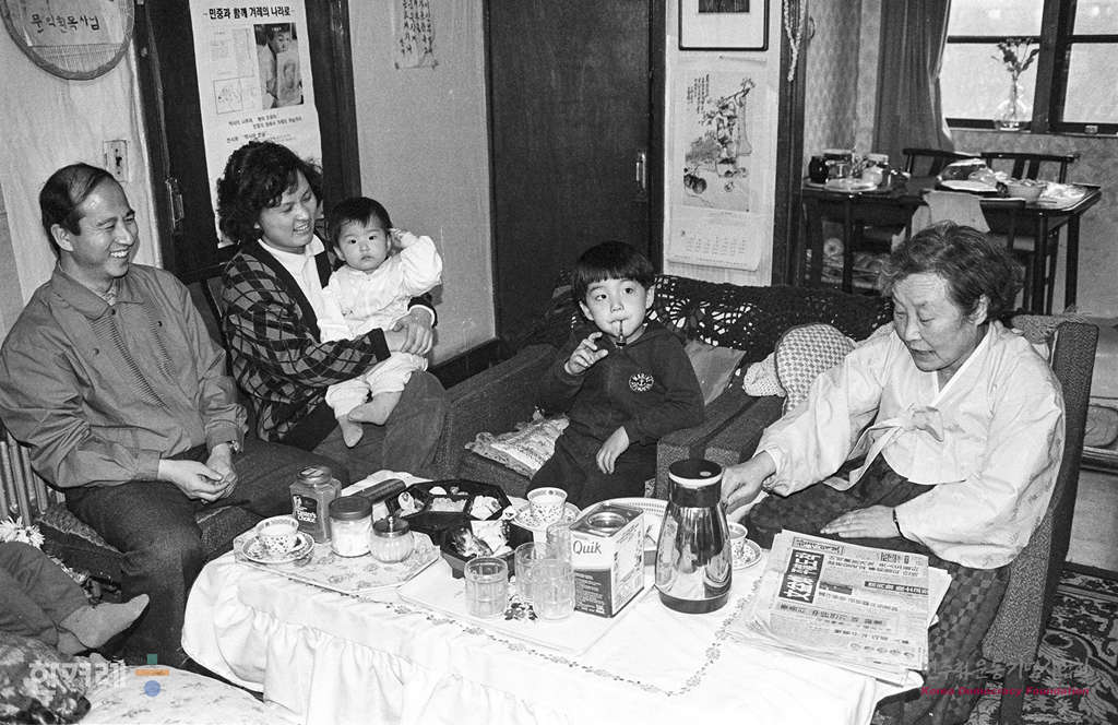 - 1989년 3월 26일 문익환 목사 북한방문이 알려진 서울 도봉구 수유동 문목사집에는 부인 박용길씨와 문목사의 노모 김신묵씨 이웃 친지들이 둘러앉아 북한에 사는 친척 등에 대한 이야기를 나누고 있다.