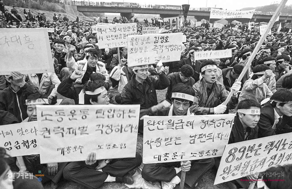 - 1989년 3월 27일 오후 5시 30분 택시노련 서울지부 산하 성동 노원 동북부지역 택시회사 노조원 1천여명은 서울 중랑구 중랑교옆 고수부지에서 완전월급제 쟁취 지역결의대회를 갖고 있다.