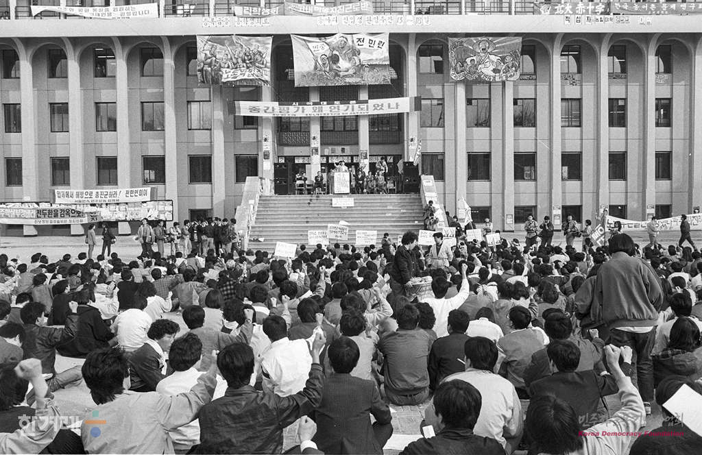 - 1989년 3월 26일 시민과 학생, 재야단체회원들이 서울 고려대 민주광장에서 노태우정권 퇴진을 위한 공동투쟁본부에서 개최한 ‘중간평가 왜 연기되었나? 주제로 시국대토론회를 하고 있다.