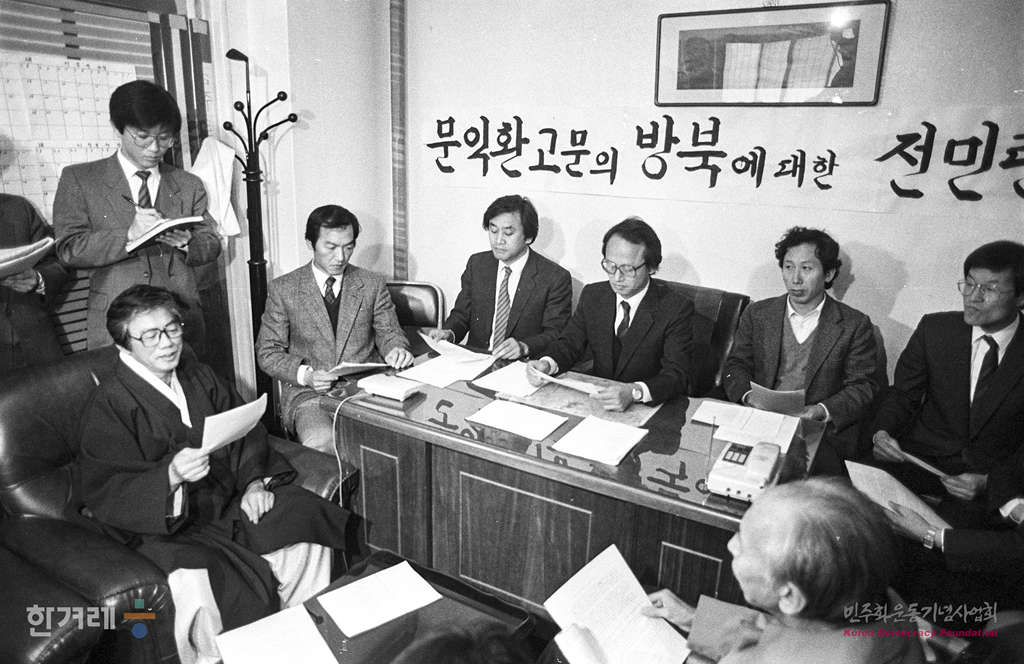 - 1989년 3월 27일 문익환 고문의 평양방문과 관련해 전국민족민주운동연합(전민련) 이부영 의장을 비롯한 의장단이 서무실에서 기자회견을 갖고 있다.