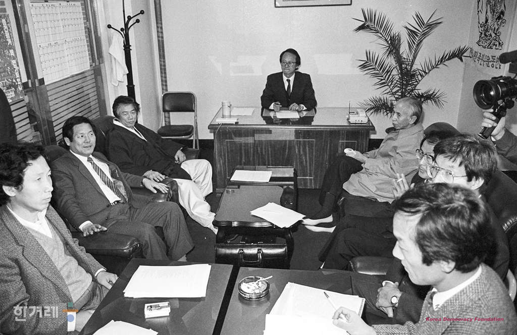 - 1989년 3월 27일 문익환 고문의 평양방문과 관련해 전국민족민주운동연합(전민련) 이부영 의장을 비롯한 의장단이 서무실에서 기자회견에 앞서 회의를 하고 있다