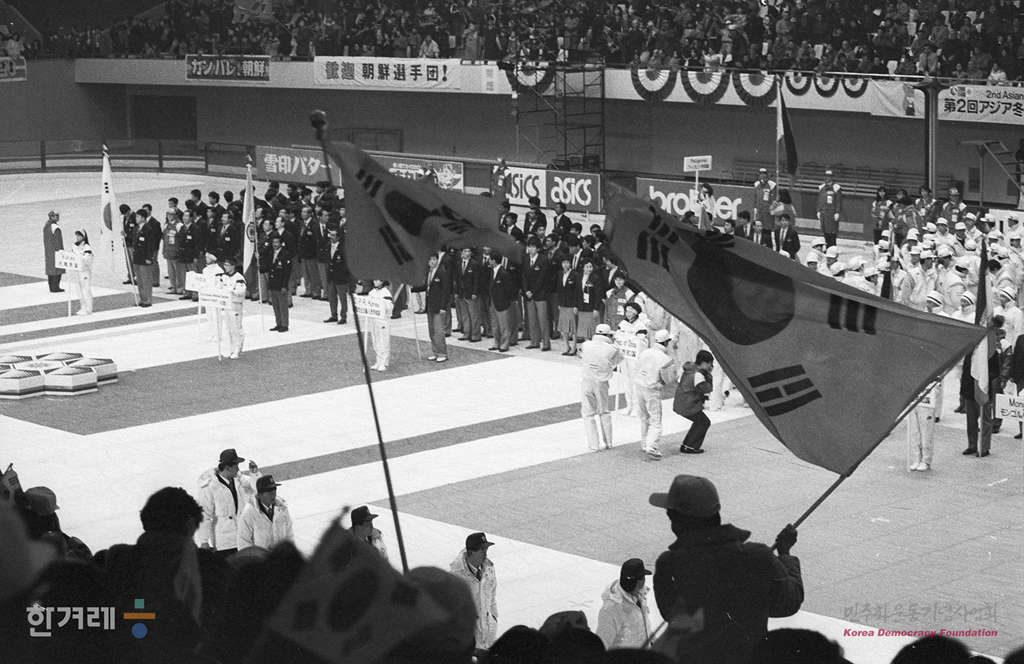 - 1989년 3월 9일 제2회 겨울철아시아경기대회 개막식에 관중의 절반이 넘는 민단쪽과 조총련쪽 응원단이 각각 남북한 선수단을 응원하며 태극기와 인민공화국기를 흔들며 응원을 하고 있다.