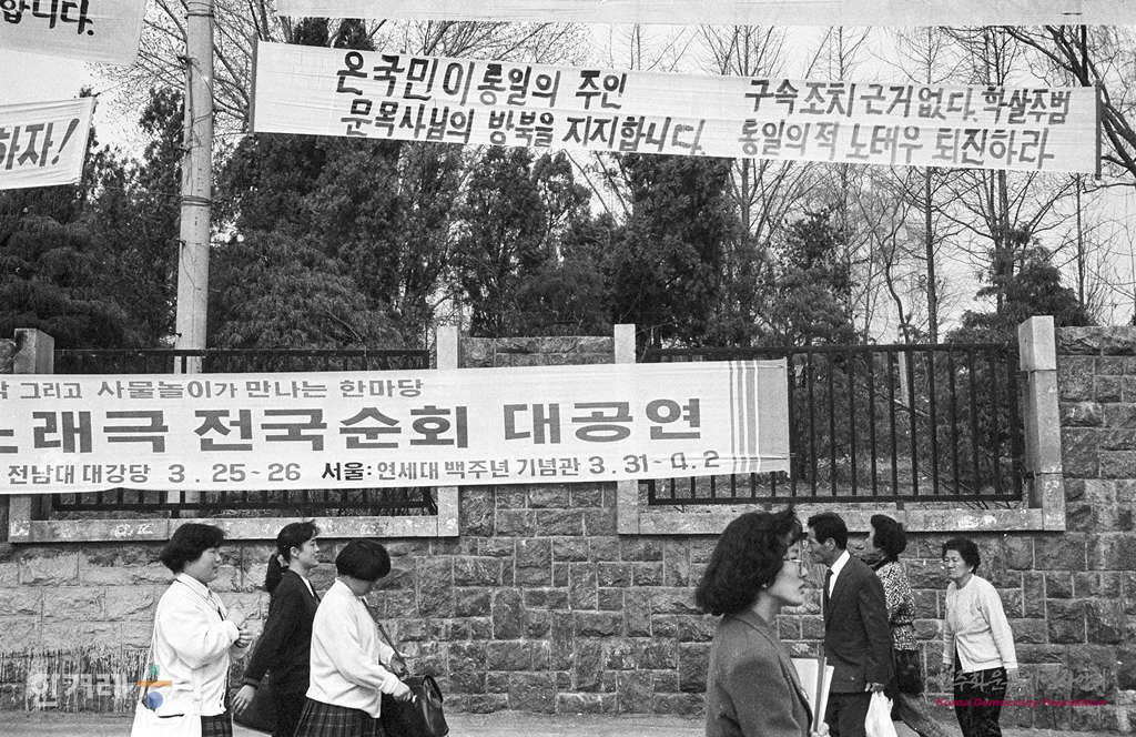 - 1989년 3월 28일 문익환 목사의 평양방문이 알려지자 이에 대한 지지와 규탄성명이 서울과 지방에서 잇따라 발표되는 가운데 서울 연세대학교앞에는 문목사의 방북을 지지하는 현수막이 걸려 있다.