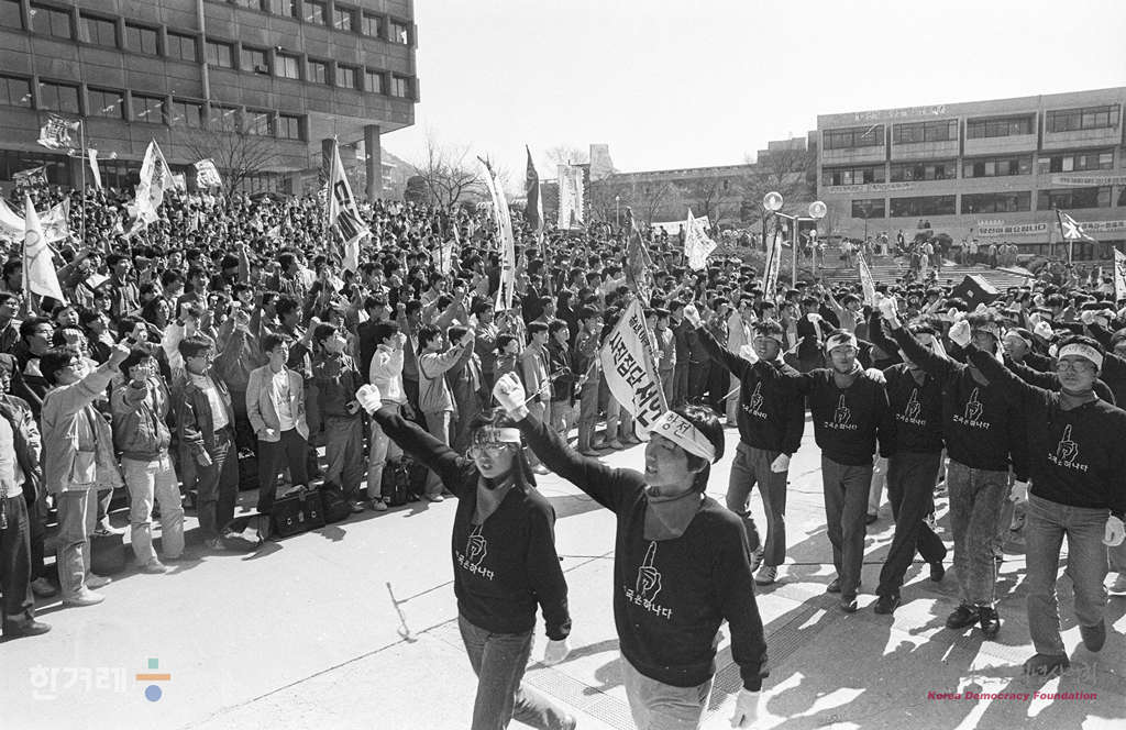 - 1989년 3월 29일 서울대 민주광장에서 서울대 총학생회 발대식을 갖고 있다. 총학생회장이 된 문광명씨는 서울지역총학생회연합 2기 부의장 겸 전국대학생대표자협의회에서 부의장을 맡고 있다.