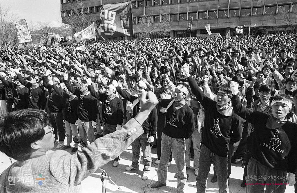 - 1989년 3월 29일 서울대 민주광장에서 서울대 총학생회 발대식을 갖고 있다. 총학생회장이 된 문광명씨는 서울지역총학생회연합 2기 부의장 겸 전국대학생대표자협의회에서 부의장을 맡고 있다.