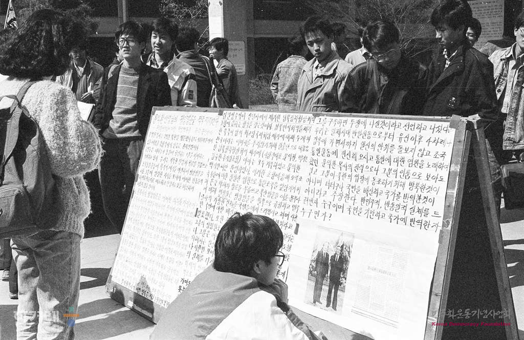 - 1989년 3월 29일 문익환 목사의 평양방문이 알려지자 이에 대한 지지와 규탄성명이 서울과 지방에서 잇따라 발표되는 가운데 서울 서울대 인문대앞 광장계시판에 문목사 방북을 지지하는 내용의 대자보가 나붙어 학생들의 눈길을 끌고 있다.