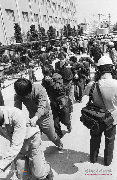- 1989년 3월 30일 현대중공업 노동자들의 파업농성이 1백9일만인 30일 건국이래 최대병력과 장비를 동원한 경찰의 두 차례에 걸친 강제진압 작전에 의해 해산된 가운데 울산 오좌불숙소에서 농성을 하고 있는 현대중공업 노동자 2천여명을 경찰이 강제진압에 나서 노동자들을 연행하고 있다.