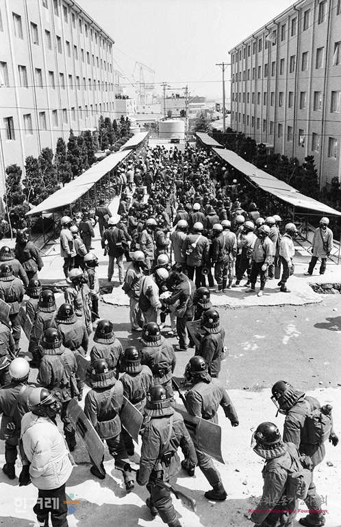 - 1989년 3월 30일 현대중공업 노동자들의 파업농성이 1백9일만인 30일 건국이래 최대병력과 장비를 동원한 경찰의 두 차례에 걸친 강제진압 작전에 의해 해산된 가운데 울산 오좌불숙소에서 농성을 하고 있는 현대중공업 노동자 2천여명을 경찰이 강제진압에 나서 노동자들을 연행하고 있다.