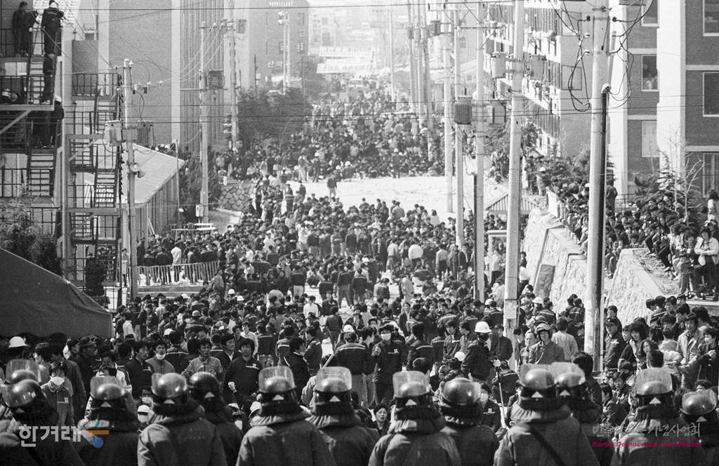 - 1989년 3월 30일 현대중공업 노동자들의 파업농성이 1백9일만인 30일 건국이래 최대병력과 장비를 동원한 경찰의 두 차례에 걸친 강제진압 작전에 의해 해산된 가운데 울산 오좌불숙소에서 농성을 하고 있는 현대중공업 노동자 2천여명을 경찰이 강제진압에 나서 노동자들을 연행하고 있다.