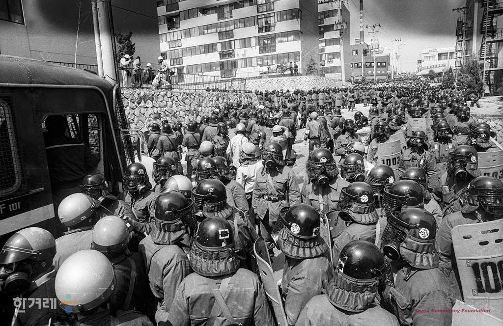 - 1989년 3월 30일 현대중공업 노동자들의 파업농성이 1백9일만인 30일 건국이래 최대병력과 장비를 동원한 경찰의 두 차례에 걸친 강제진압 작전에 의해 해산된 가운데 울산 오좌불숙소에서 농성을 하고 있는 현대중공업 노동자 2천여명을 경찰이 강제진압에 나서 노동자들을 연행하고 있다.