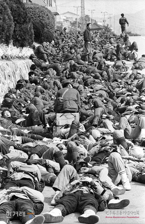 - 1989년 3월 30일 현대중공업 노동자들의 파업농성이 1백9일만인 30일 건국이래 최대병력과 장비를 동원한 경찰의 강제진압작전에 예상되는 가운데 동원된 경찰들이 현대중공업 인근도로에 누워 휴식을 취하고 있다