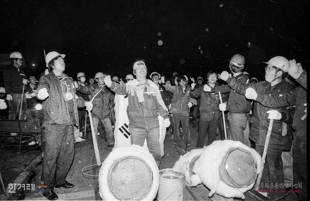 - 1989년 3월 29일 현대중공업 노동자들의 파업농성이 1백9일만인 30일 건국이래 최대병력과 장비를 동원한 경찰의 강제진압 작전이 예정된 가운데 이원건 위원장을 비롯한 파업지도부는 끝가지 투쟁할 것을 결의하고 있다.