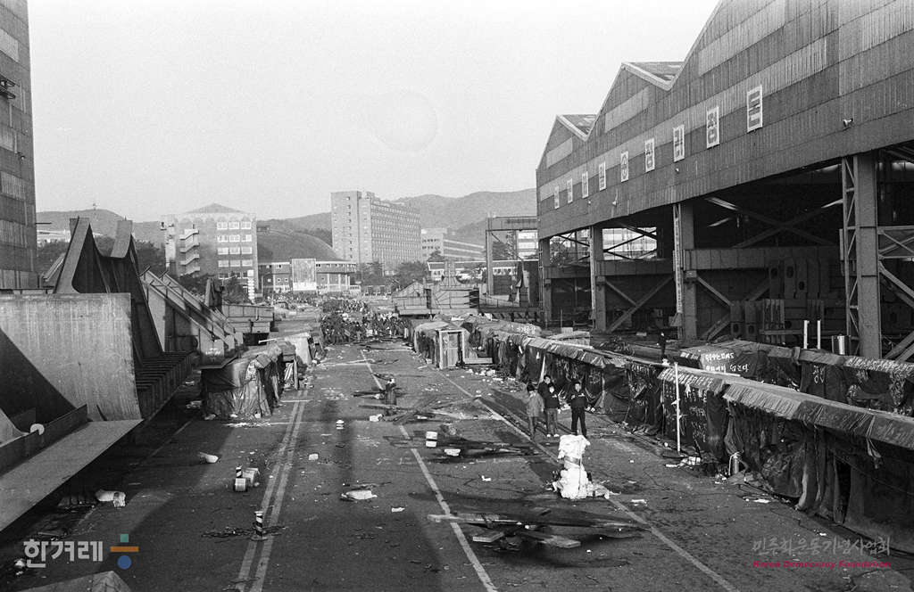 - 1989년 3월 30일 현대중공업 노동자들의 파업농성 1백9일만에 건국이래 최대병력과 장비를 동원한 경찰의 강제진압 작전이 시작되고 있다.