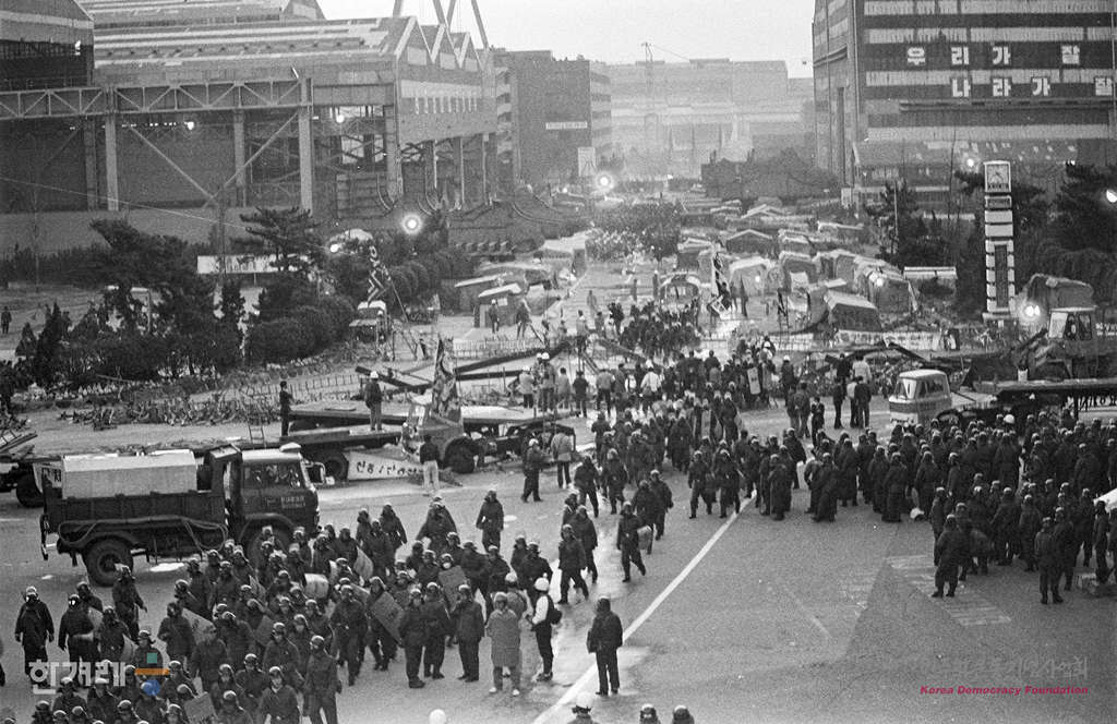 - 1989년 3월 30일 현대중공업 노동자들의 파업농성 1백9일만에 건국이래 최대병력과 장비를 동원한 경찰의 강제진압 작전이 시작되고 있다.