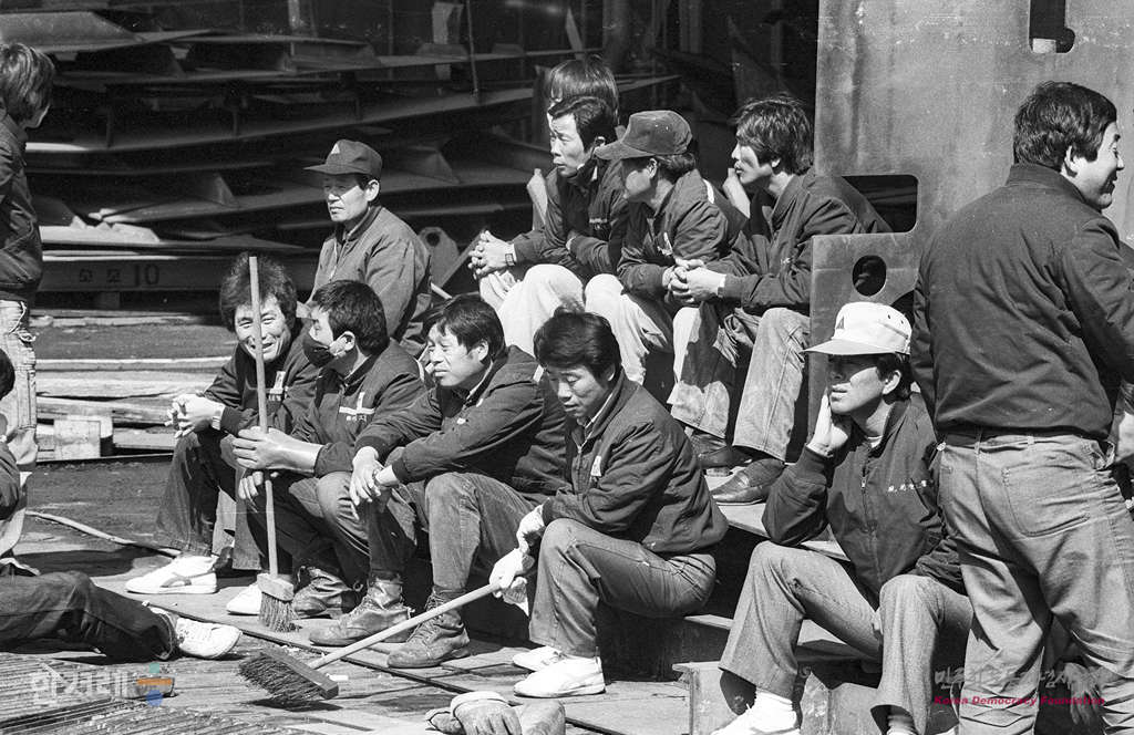 - 1989년 3월 30일 현대중공업 노동자들의 파업농성 1백9일만에 건국이래 최대병력과 장비를 동원한 경찰의 강제진압 작전으로 진압된 뒤 일부 노동자들이 삼삼오오 농성인근 텐트에서 얘기를 나누고 있다.