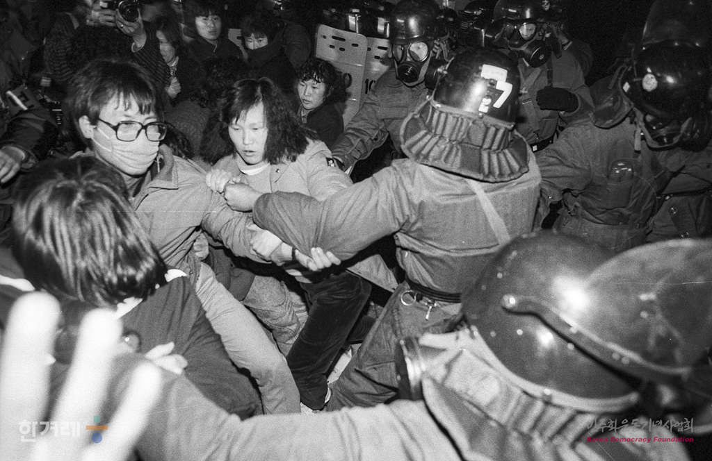 - 1989년 3월 30일 현대중공업 노동자들의 파업농성 1백9일만에 건국이래 최대병력과 장비를 동원한 경찰의 강제진압 작전이 예상되는 가운데 노동자 가족들이 회사앞에서 노사협상을 요구하며 농성을 벌이다 경찰과 마찰을 빗고 있다..