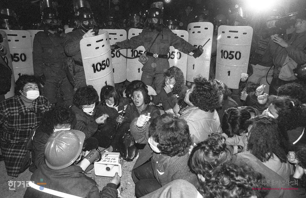 - 1989년 3월 30일 현대중공업 노동자들의 파업농성 1백9일만에 건국이래 최대병력과 장비를 동원한 경찰의 강제진압 작전이 예상되는 가운데 노동자 가족들이 회사앞에서 노사협상을 요구하며 농성을 벌이다 경찰과 마찰을 빗고 있다..