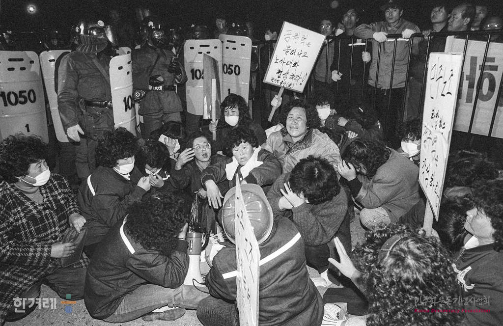 - 1989년 3월 30일 현대중공업 노동자들의 파업농성 1백9일만에 건국이래 최대병력과 장비를 동원한 경찰의 강제진압 작전이 예상되는 가운데 노동자 가족들이 회사앞에서 노사협상을 요구하며 농성을 벌이다 경찰과 마찰을 빗고 있다...