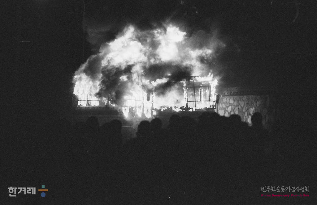 - 1989년 3월 30일 현대중공업 노동자들의 파업농성 1백9일만에 건국이래 최대병력과 장비를 동원한 강제진압으로 해산된 노동자들이 거리시위 도중 시위대가 던진 화염병으로 전경버스가 불타고 있다.